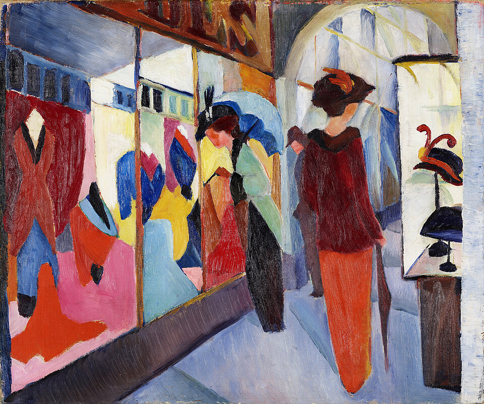 August implemented the ideas gathered during his stay in Paris in his own works, as seen in this painting that shows a display window with bright colours and reflections on the panes. Look at the woman with the green coat and blue umbrella, leaning forward slightly as if she sees something that she would like to buy.